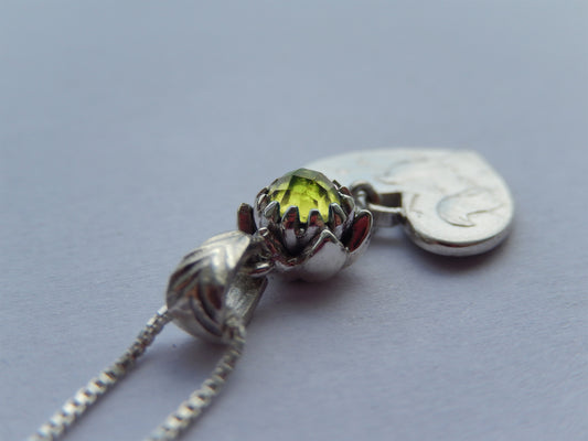 One Cent Heart and Protea Birthstone Necklace - August (Peridot)