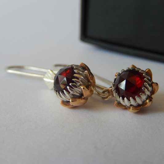 Solid 9ct Yellow Gold Petite Protea Hook Earrings (Red Garnet)