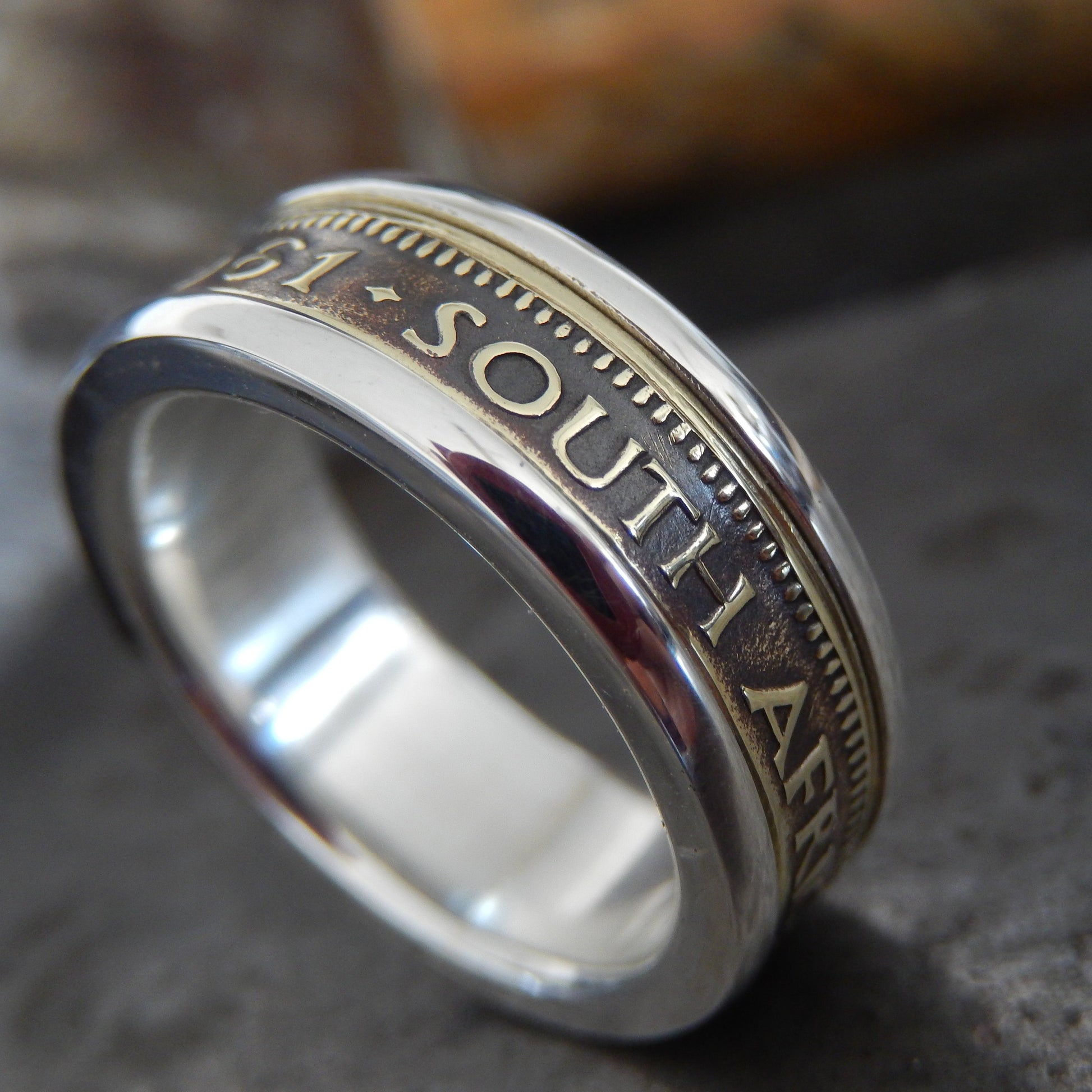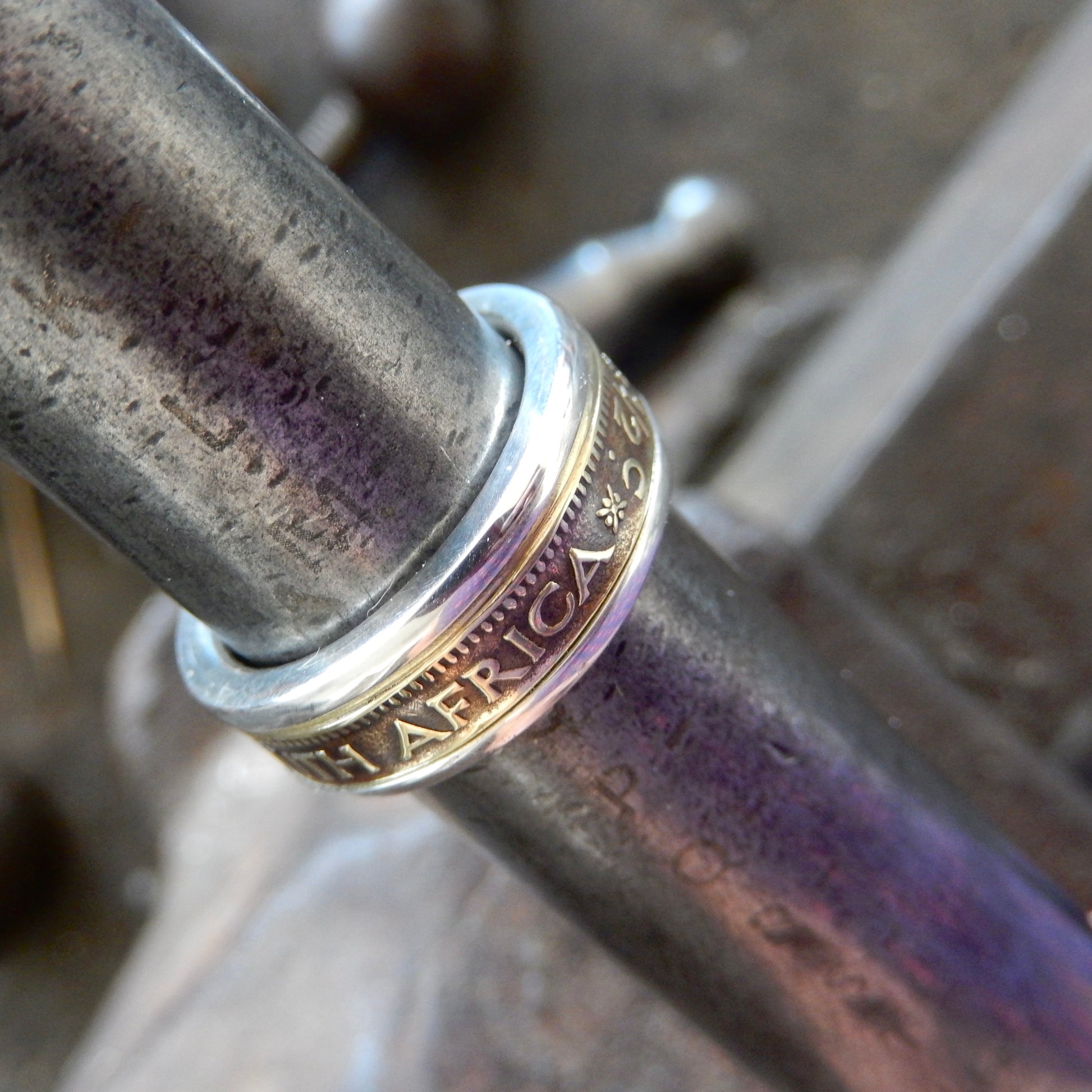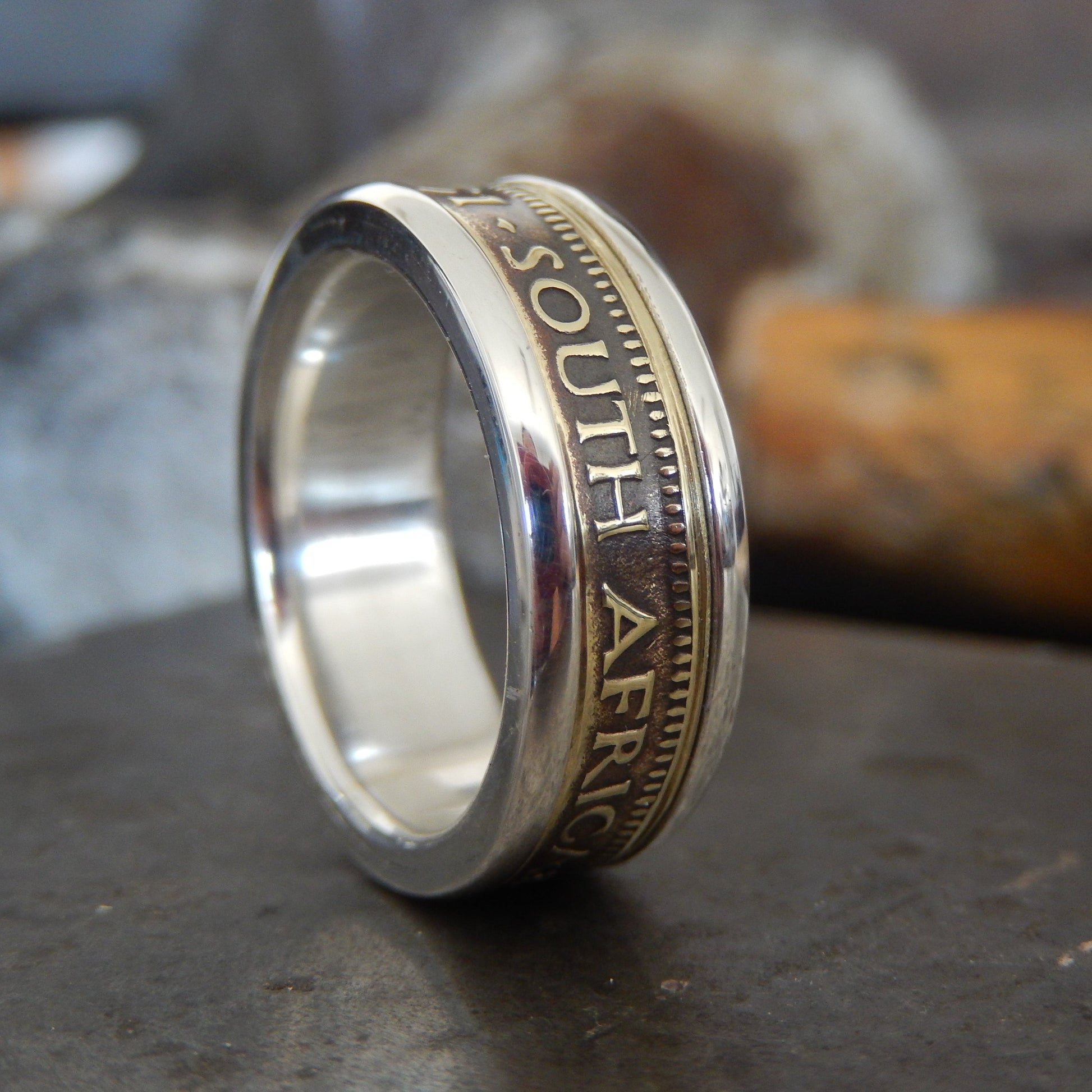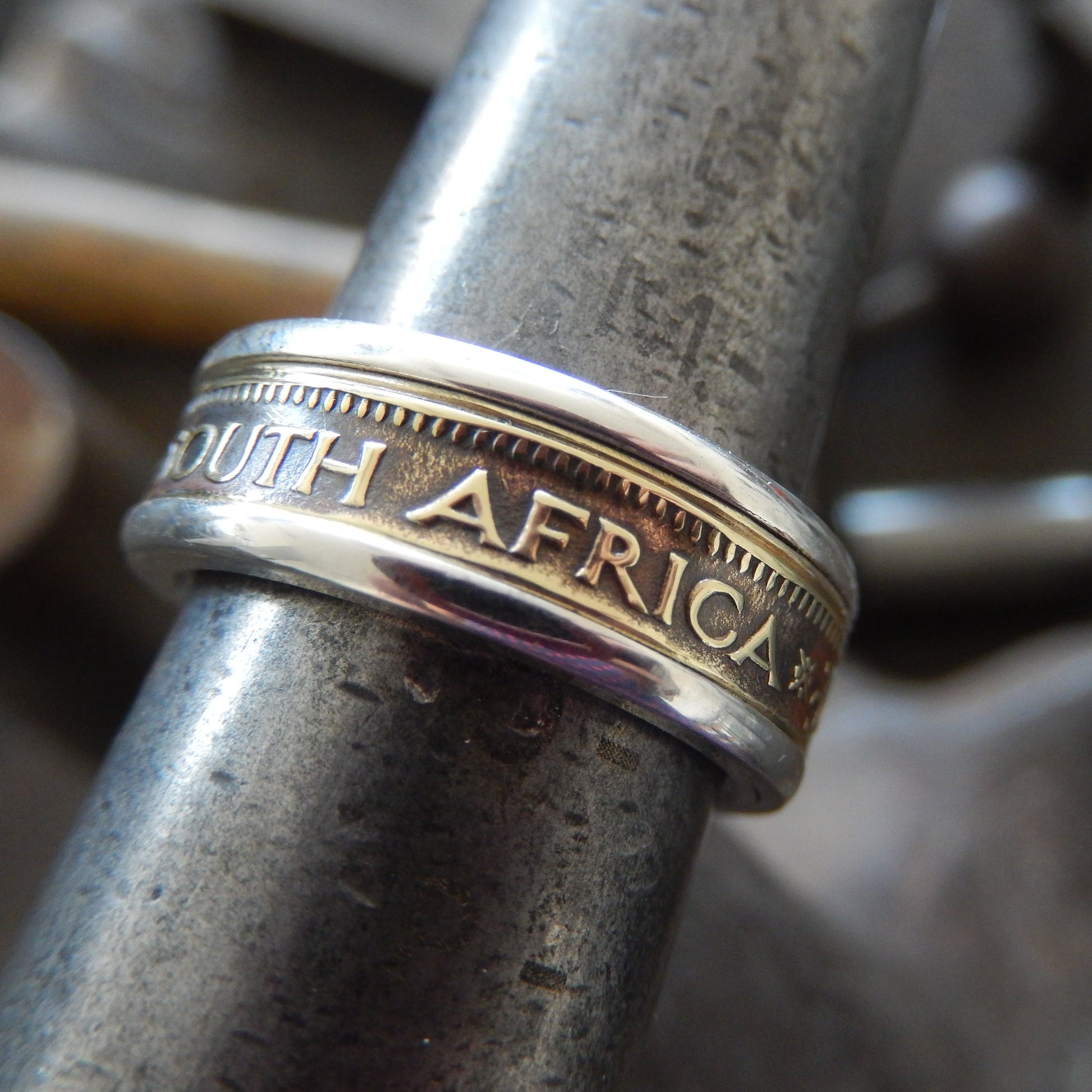 Crafted from a 1961 South African half-cent coin, this ring embodies a pivotal moment in the nation's history. The brass coin is skillfully shaped into a band and set inside a sterling silver inlay, creating a timeless piece that celebrates heritage and independence.
