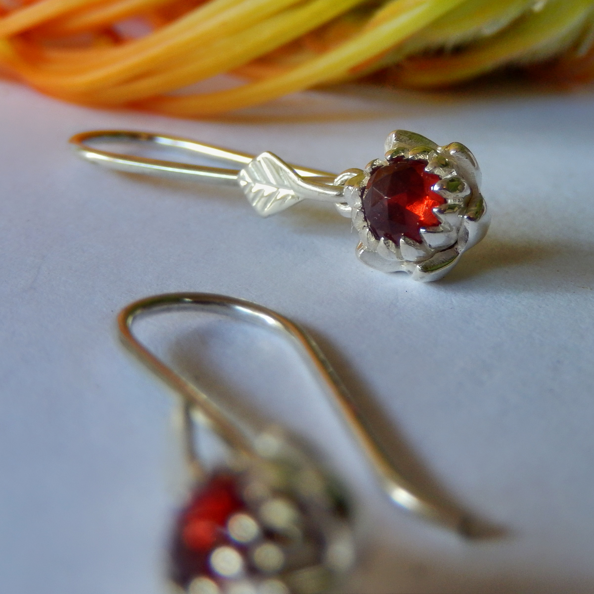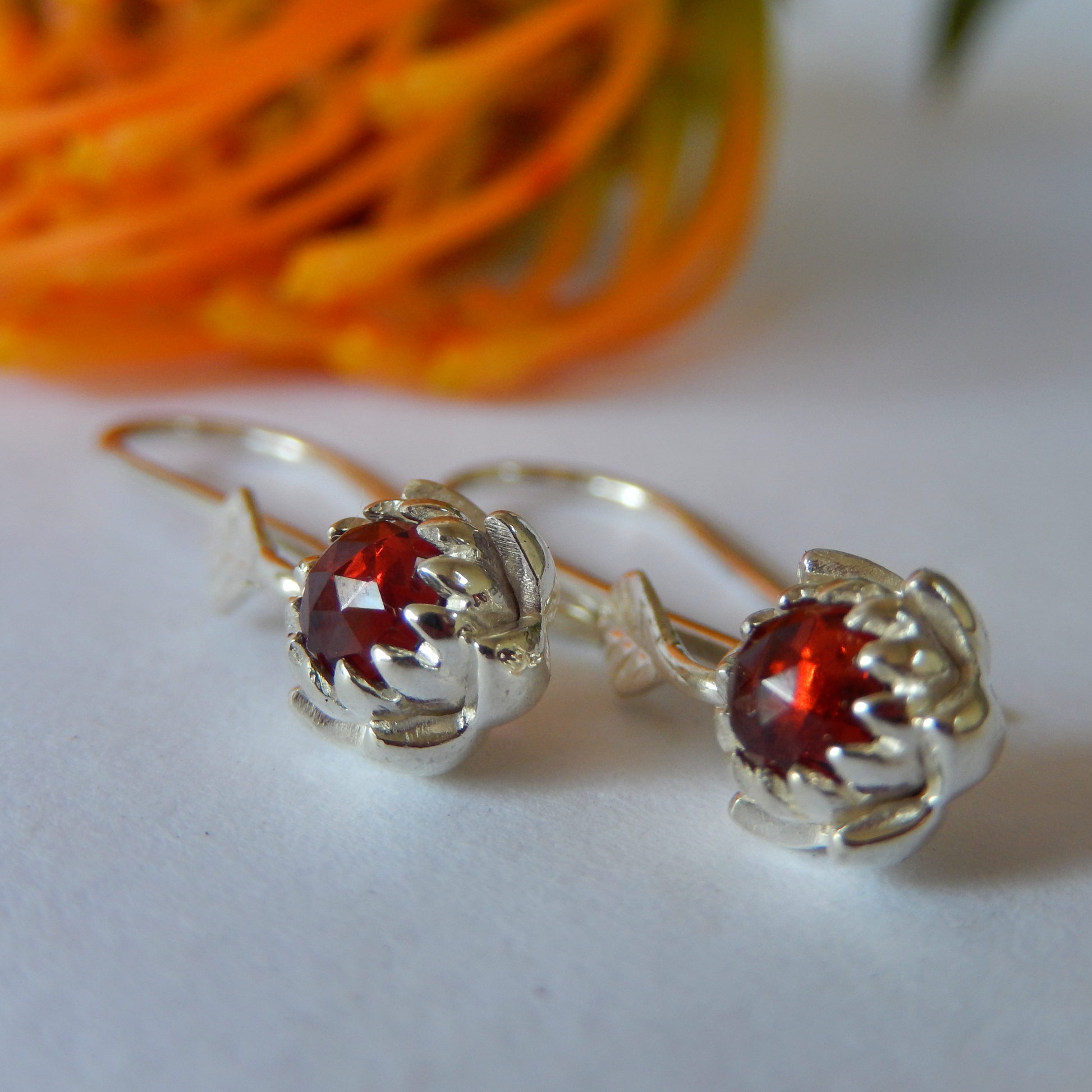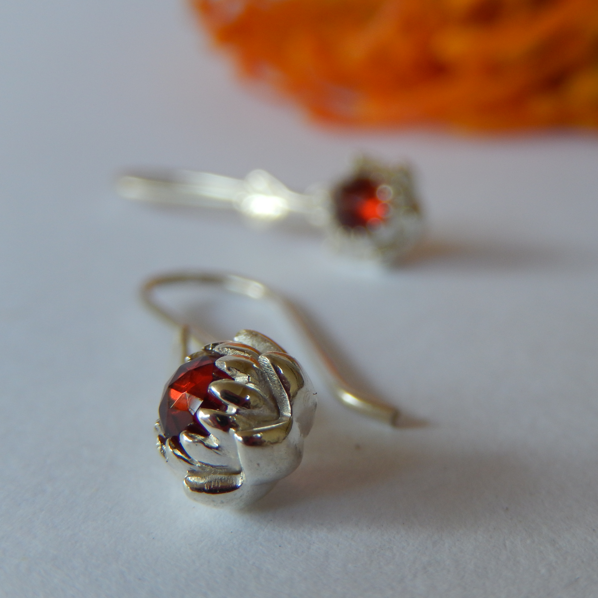 The Petite Protea earrings offer a subtle tribute to South African heritage, with 4mm rose-cut natural red garnets and 925 sterling silver craftsmanship.
