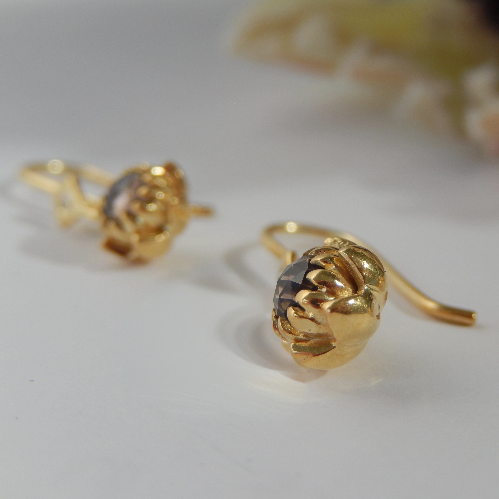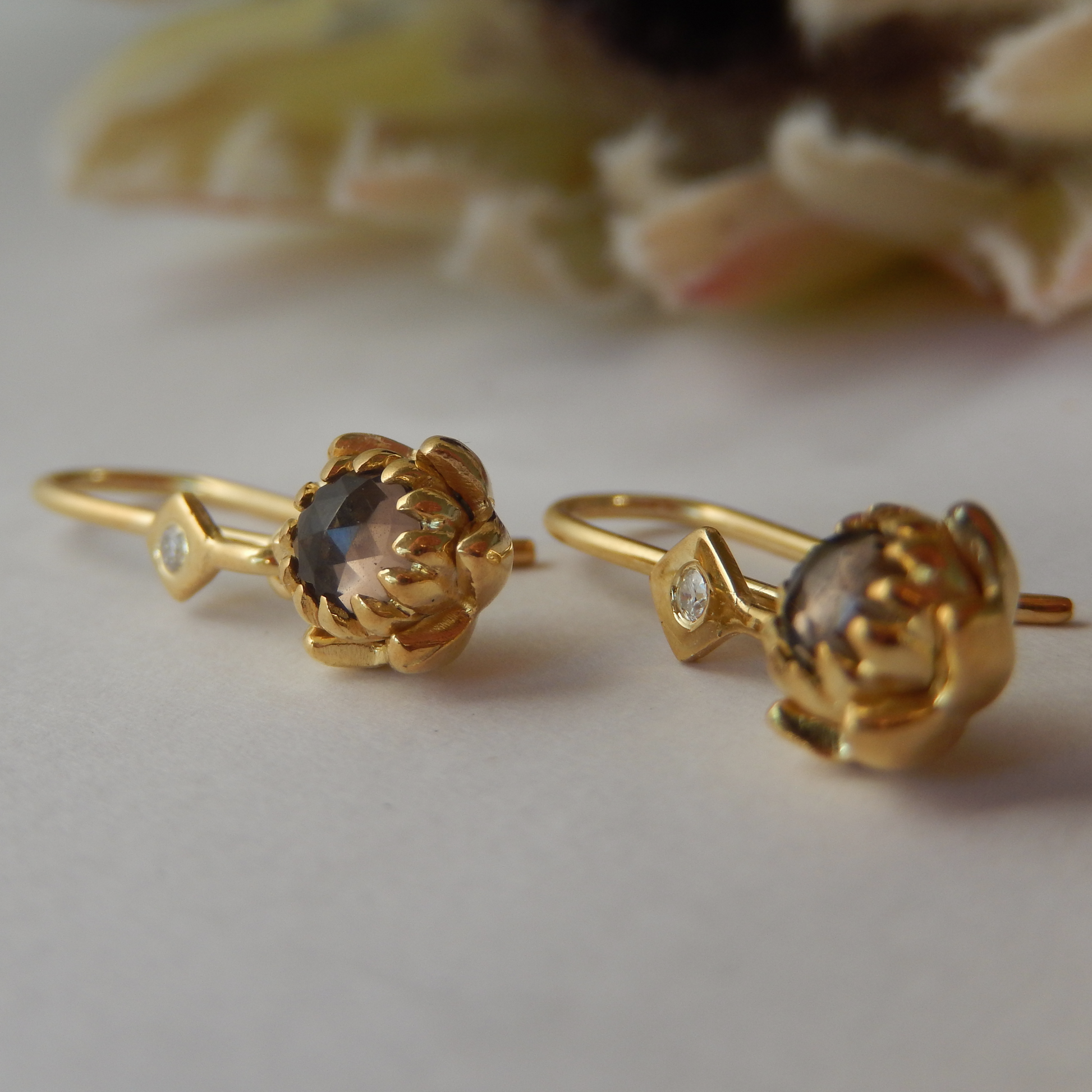 Solid 9ct Yellow Gold Petite Protea Hook Earrings (Smokey Quartz)