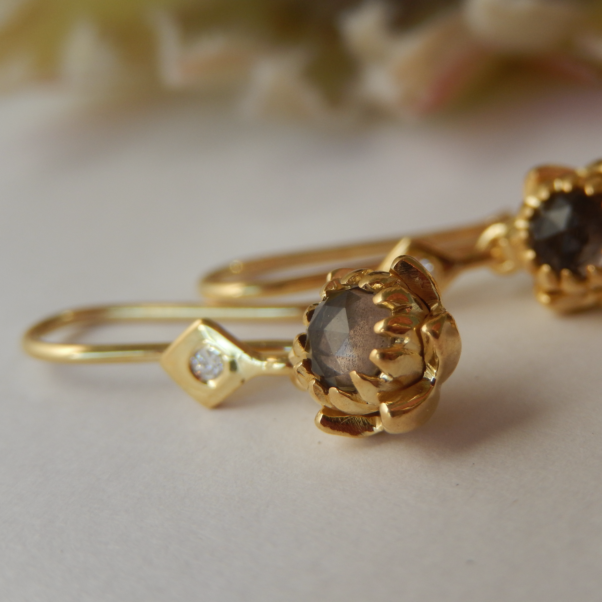 These Solid 9ct Yellow Gold Petite Protea Hook earrings offer a subtle tribute to South African heritage, with 4mm rose-cut Natural Smokey Quartz and hand finished 9ct Yellow Gold craftsmanship.